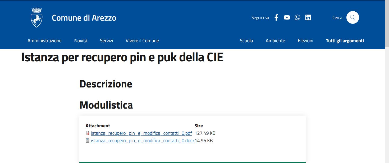 Facendo con computer una ricerca partendo da "comune arezzo richiesta pin e puk della CIE" e poi: "Istanza per recupero pin e puk della CIE" compare una pagina con due link: 1) istanza_recupero_pin_e_modifica_contatti_0.pdf 127.49 KB 2) istanza_recupero_pin_e_modifica_contatti_0.docx 14.96 KB Ambedue danno la risposta: "The requested page was not found. "