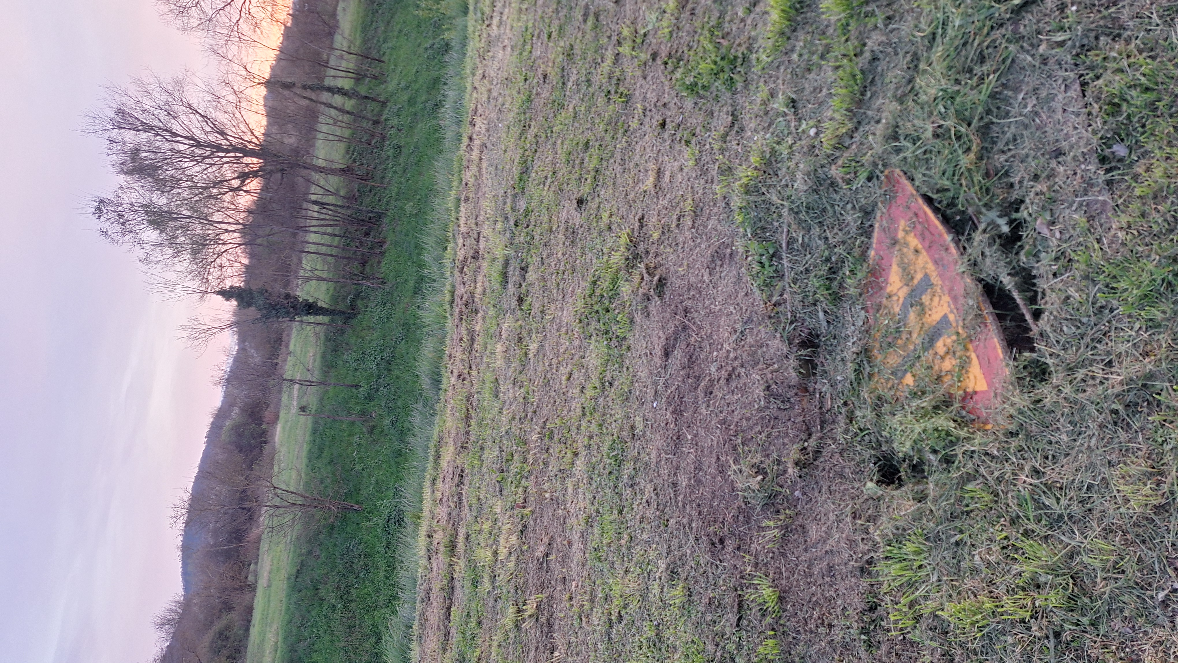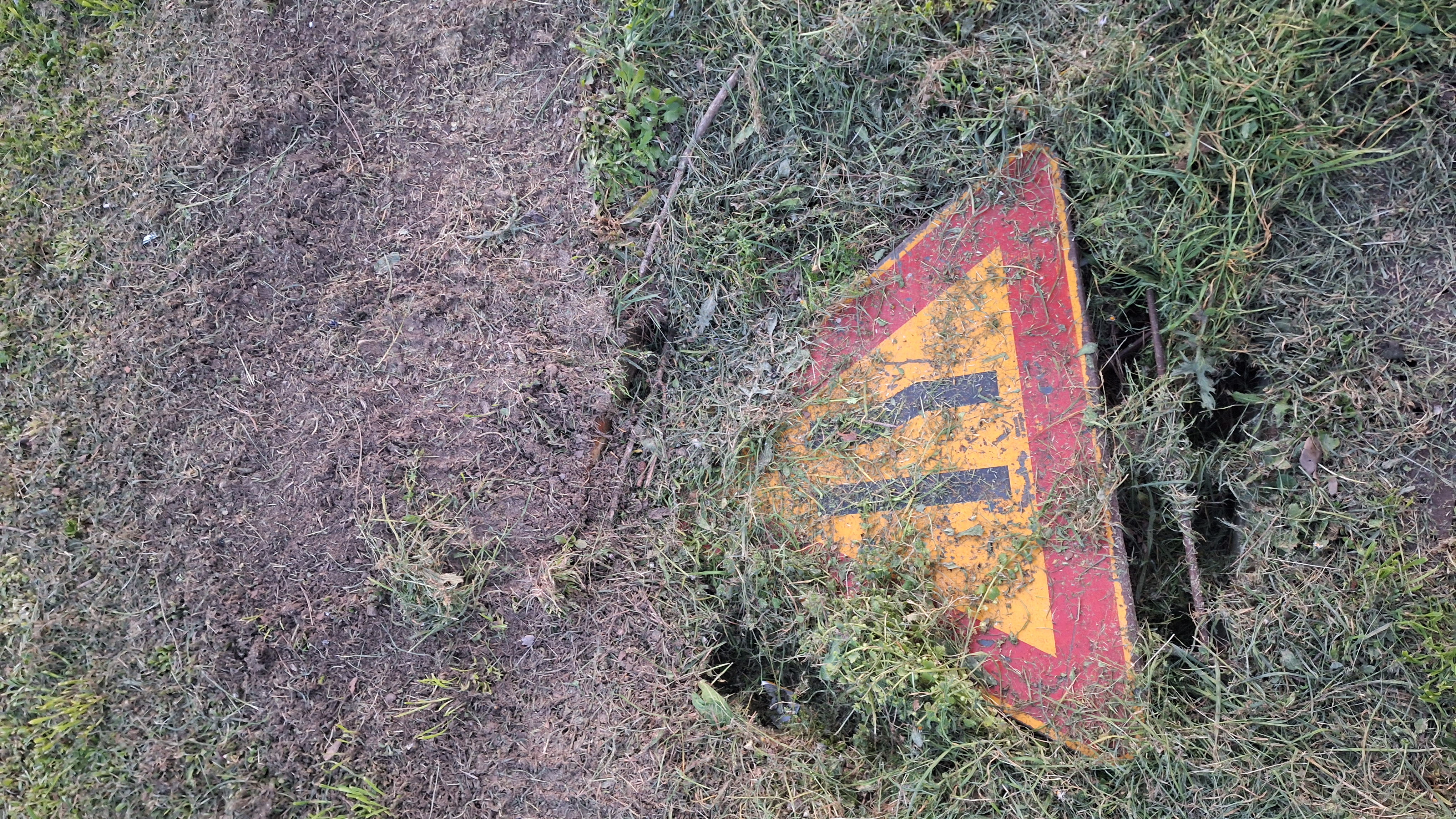Lungo strada presenza di una buca sul terreno pubblico, coperta da un cartwllo stradale divelto ed erba appena tagliata che la rende appena visibile. Possibile rischio cadute e lesioni gravi anche da taglio